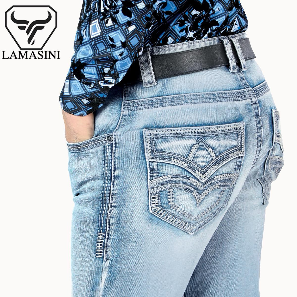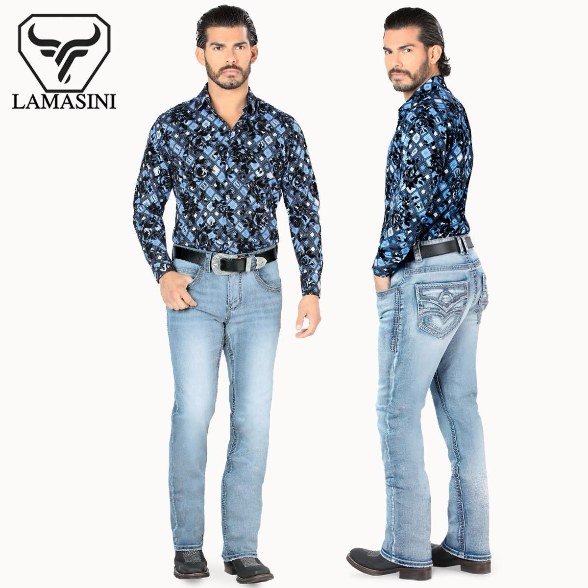 Premium Denim Embroidery Jeans with Modern Boot Cut, High Quality Cotton, Lamasini Lam1867 Light blue All Seasons, Button Closure, Western Style Classic Menswear